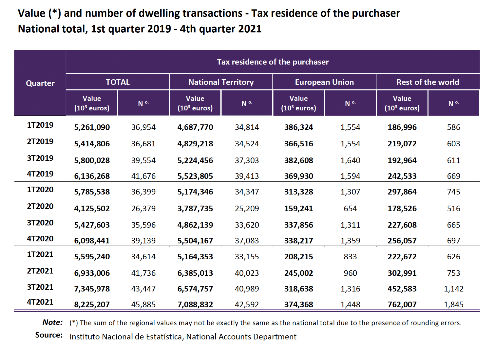 The same report included a detailed Excel table (reproduced below), covering quarterly data from Q1 2019 to Q4 2021. It showed, for each period, the number and value of homes purchased by buyers with fiscal residence in Portugal, the EU, or non-EU countries.