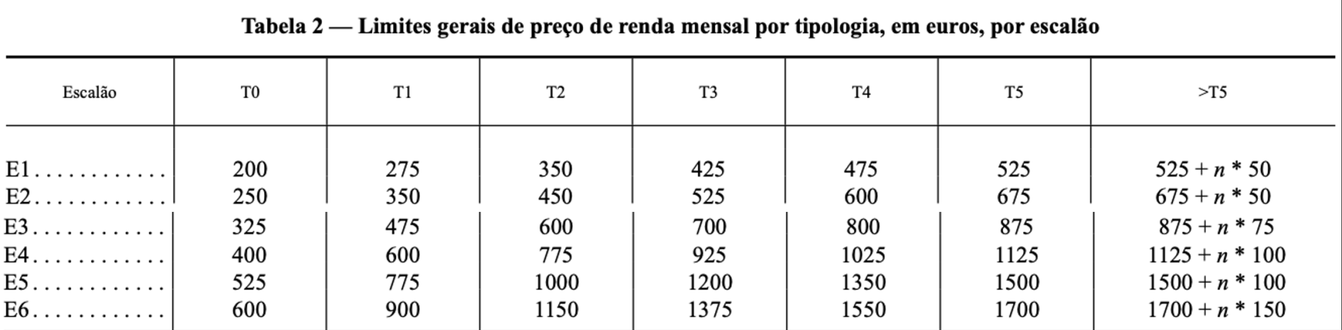 The rent in question may not exceed by more than 50% the “general rent price limits by typology” applicable under the Affordable Rental Programme, which were defined in 2019 according to a six-tier municipal matrix set out in Table 1 (annexed to Ministerial Order no. 176/2019, whose amounts, it should be noted, “may be updated annually”).